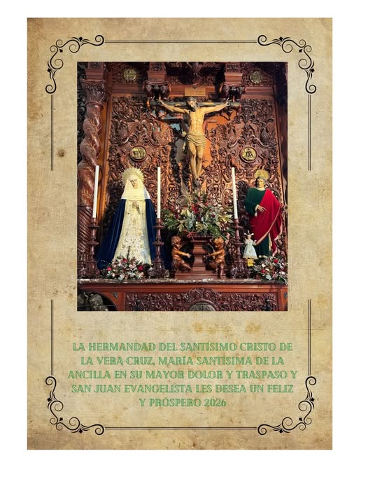 La Junta de Gobierno de la Hermandad y Cofradía de Nazarenos del Stmo. Cristo de la Vera Cruz, María Stma. de la Ancilla en su Mayor Dolor y Traspaso y San Juan Evangelista les desean una feliz Navidad y un próspero año nuevo 2026. |