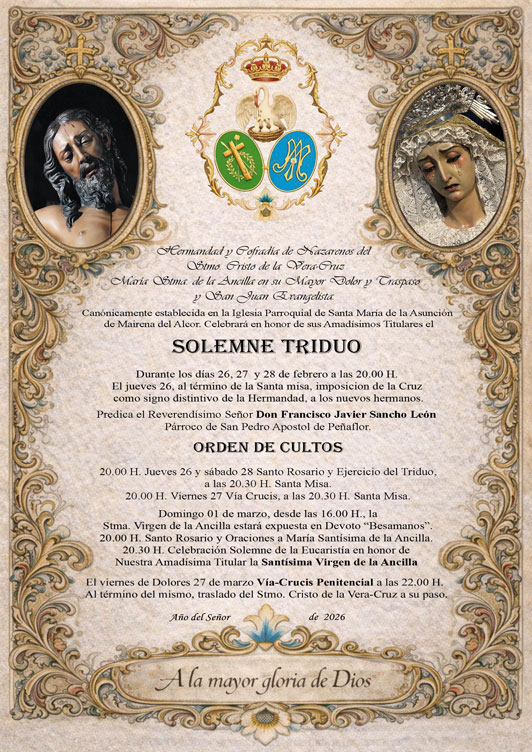 La Junta de Gobierno de la Hermandad y Cofradía de Nazarenos del Stmo. Cristo de la Vera Cruz, María Stma. de la Ancilla en su Mayor Dolor y Traspaso y San Juan Evangelista les desea una feliz y próspero año nuevo 2026. |
