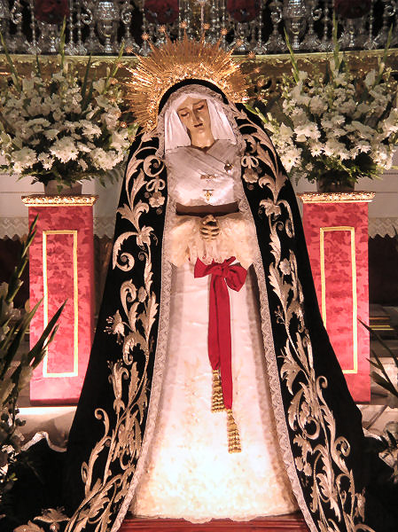La imagen de María Santísima de la Ancilla en su Mayor Dolor y Traspaso, es una bella imagen esculturada de las llamadas de "Candelero", fue adquirida el 22 de Enero de 1.940 en el convento de las Religiosas Mínimas de Triana (Sevilla), cuya Madre Superiora en escrito enviado al Ilmo. Sr. Vicario General del Arzobispado de Sevilla, con fecha 14 de Noviembre de 1.939, entre otras cosas dice: "Que realmente existe en el Convento una imagen de la Santísima Virgen, de candelero, de tiempo inmemorial", donde tenía la advocación de Nuestra Señora en sus Misterios Dolorosos. Suele atribuirse a Montes de Oca del siglo XVIII. Fue restaurada por el escultor local D. Antonio Gavira Alba en 1.965, como consecuencia de una caída que sufrió desde el Altar Mayor cuando se celebraban sus Cultos. Y restaurada en 1993 por Álvarez Duarte, que llevó a efecto un nuevo candelero, consolidando su cabeza, recuperando la encarnadura original y realizando unas manos nuevas. Llama la atención su rostro severo y maduro, profundamente angustiado, pero sin perder ni un ápice de belleza. La mirada baja, el ceño fruncido y el rictus de dolor de su boca entreabierta, le otorgan una intensa expresividad. La cabeza presenta un doble giro hacia abajo y hacia la derecha, la barbilla prominente y redonda, con un característico hoyuelo.